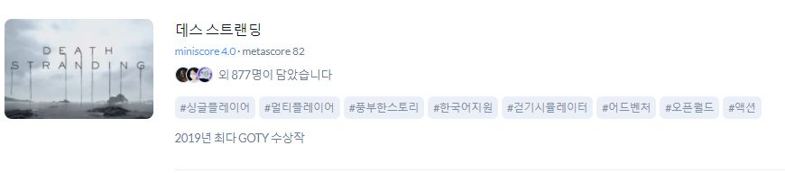 2019년 최다 고티 수상작 데스 스트랜딩. 일명 택배 게임. 이 작품도 논란이 좀 있다. 메타 스코어 82점이 말해주듯, 게임이 호불호가 많이 갈리며 너무 새롭기 때문이다. 하지만 시간이 지나고 보니 일단 게임 자체는 특이하지만 재미 자체는 있고, 그러한 새로운 시도에도 점수를 주는 사람이 많다. 다만 기존의 홍보와는 너무나 다른 이질적인 게임이고, 코지마 히데오 특유의 그 똘끼와 게임 스타일로 인해 점수는 그리 높지 않다.