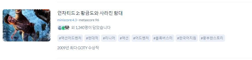 2009년 최다 고티 수상작 언차티드 2. PC위주거나 혹은 다른 멀티 플랫폼 게임이 대세이던 기존의 고티와는 다르게 플레이스테이션 콘솔 독점작이 고티를 받게 되었다. 독점작임에도 불구하고 게임의 완성도가 압도적이기에 당연했다. 그래픽도 콘솔의 성능을 뛰어넘을 정도로 압도적이었지만 게임의 재미 역시 끝내준다. 마치 긴 스릴러 드라마 시리즈를 연상시키는 스토리에, 그야말로 매달리고 쏘고 달리고 뛰는 FPS와 플랫포머 게임의 정수만을 모두 합쳐놓은 액션게임의 명작이다. 이후 이어지는 언챠티드 3와 4도 모두 명작인데 시리즈가 거듭될 수록 더 재밌어진다. 그리고 이러한 너티독의 제작 노하우는 이후의 고티에 오르는 라스트 오브 어스로 이어진다.